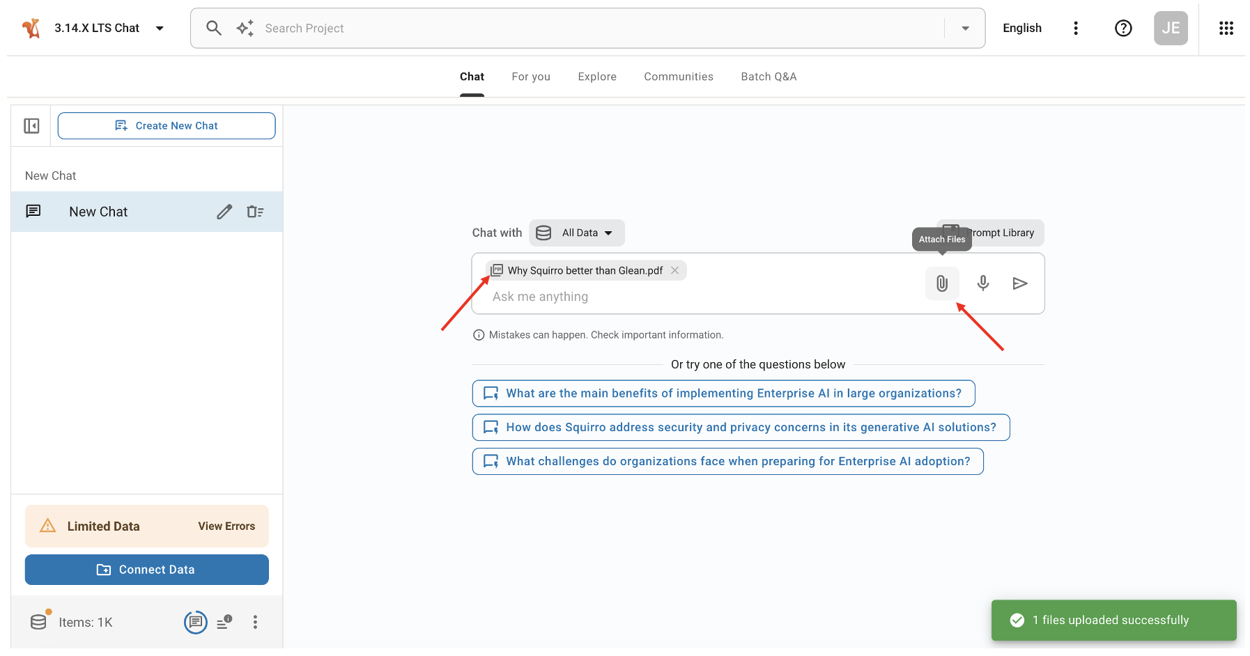 File Upload to Squirro Chat: You can now directly upload files and chat with your temporary uploaded files in Squirro Chat, enabling ad-hoc document analysis without permanent indexing.