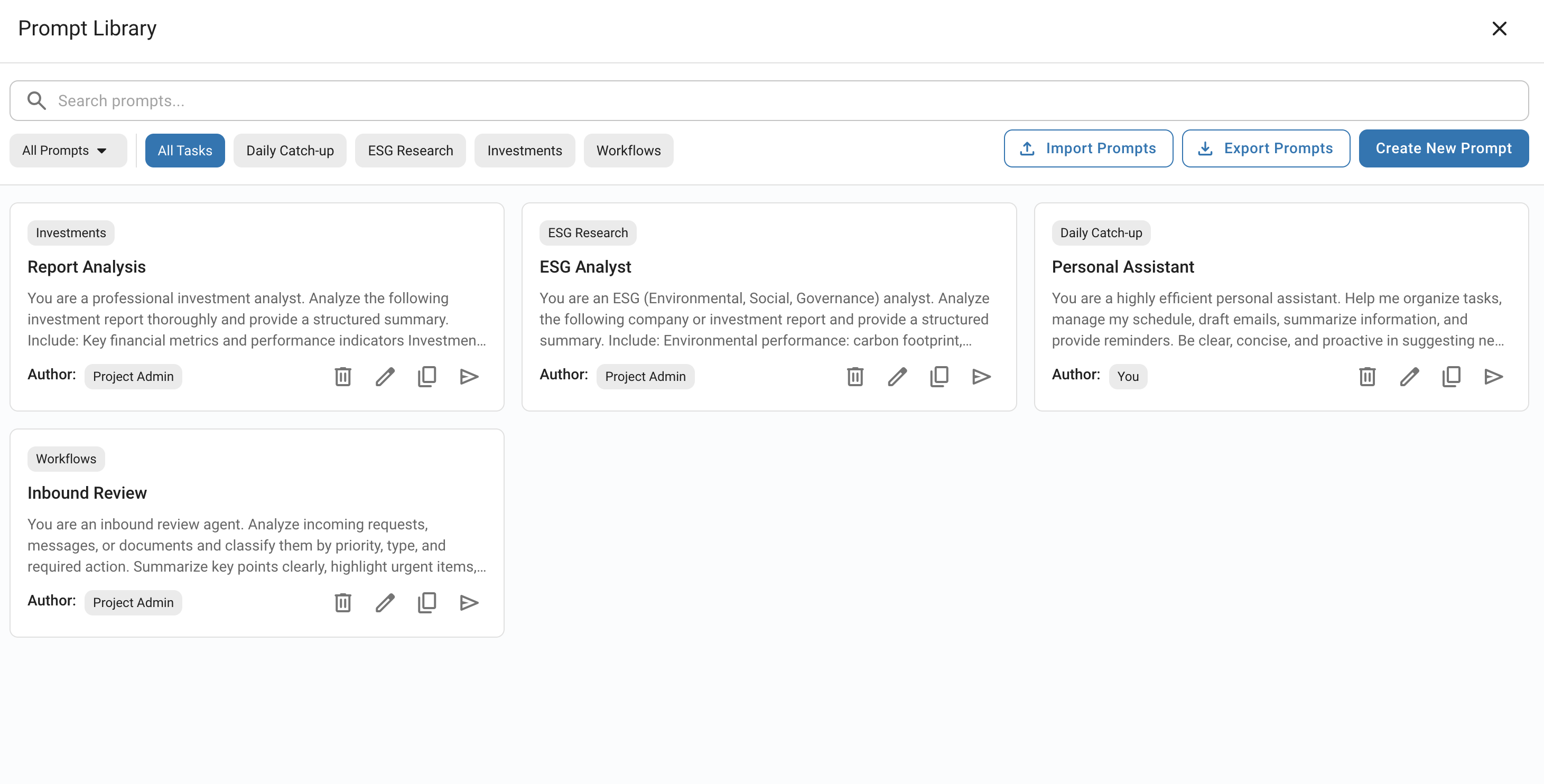 Squirro Chat Prompt Library: Added ability for users to create prompts for Squirro Chat on a user or project level. These prompts can be selected and used in the chat dashboard, enhancing customization and user experience.