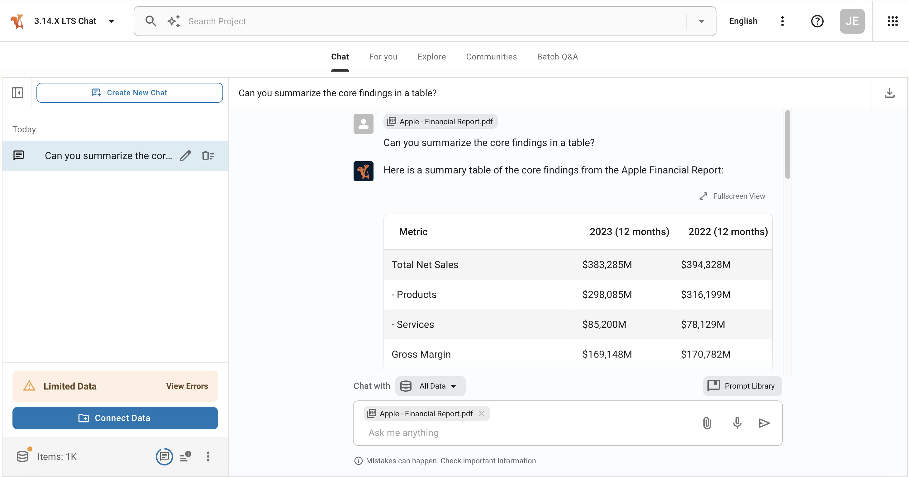 default_toolsof the Chat with Item Agent. During conversation, if information is missing, the paragraph-retriever is selectively triggered to load information on demand.Table Rendering in Chat: Added a nice table renderer to Chat widget tools output for better visualization of structured data.