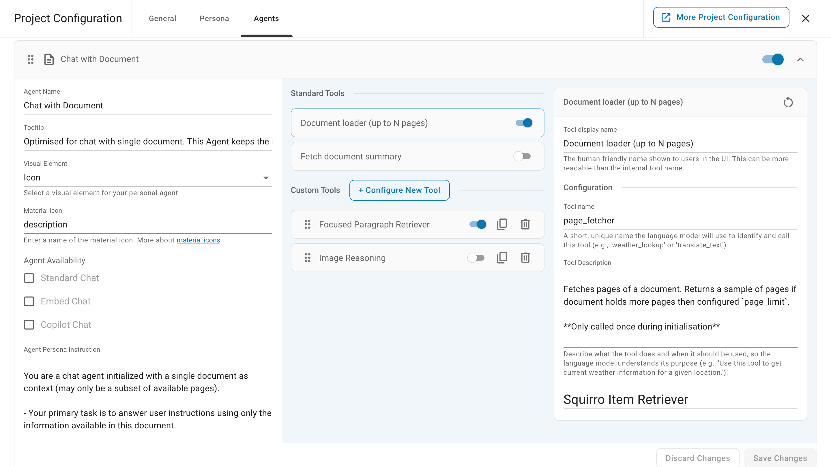 Administrators have the ability to add extra tools to expand the capabilities of the Chat with Document agent. The agent includes two pre-loaded custom tools by default, both powered by the Squirro Retriever Tool.